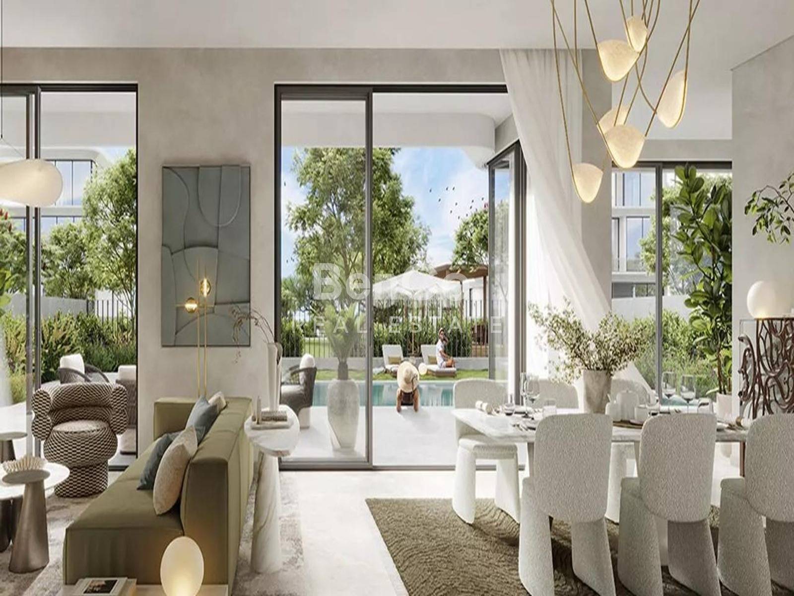 Crafted with modern design excellence, the villa features minimalist architecture, soft natural palettes and floor-to-ceiling glass that invite the outdoors in. Every space flows with warmth and sophistication from the grand living area to the open kitchen and the panoramic rooftop terrace overlooking Dubai Hills.